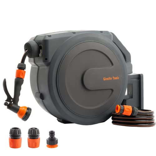 Giraffe Tools Retractable Hose Reel Wall Mounted, 35+2m Garden Hose Reel, 180° Pivotal with 7 in 1 Spray Nozzle, Grey