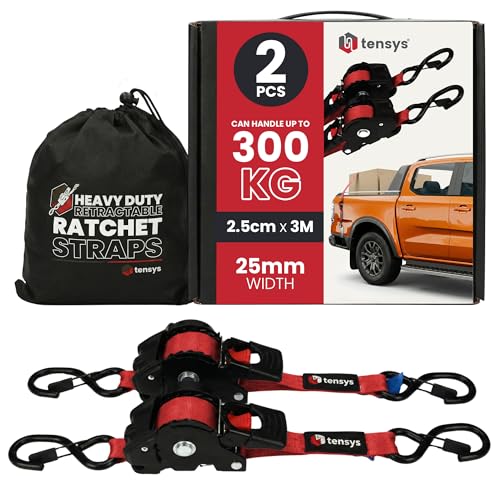 TENSYS Retractable Ratchet Tie Down Straps – Heavy Duty Auto Self Retracting Ratchet Strap Set 600kg Break Force for Cargo Trailer Roof Rack Motorcycle Luggage, Black, 2 Pack, 25mm x 3m