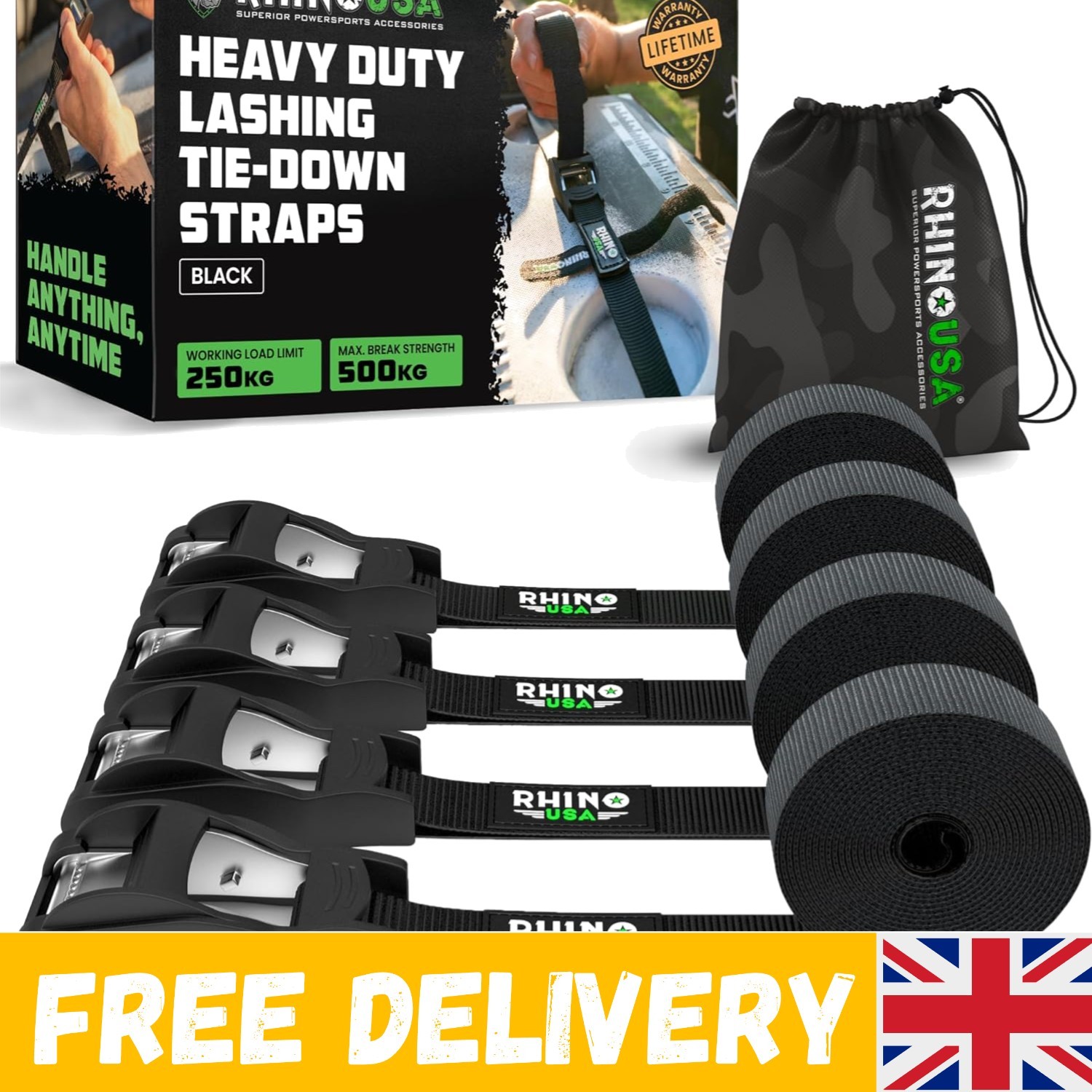 Rhino USA Retractable Ratchet Tie Down Straps (4PK) - 540kg Guaranteed Max Break Strength, Includes 2.5 cm x 3 m Autoretract Tie Downs with Padded Handles. Use for Boat, Securing Cargo - Black