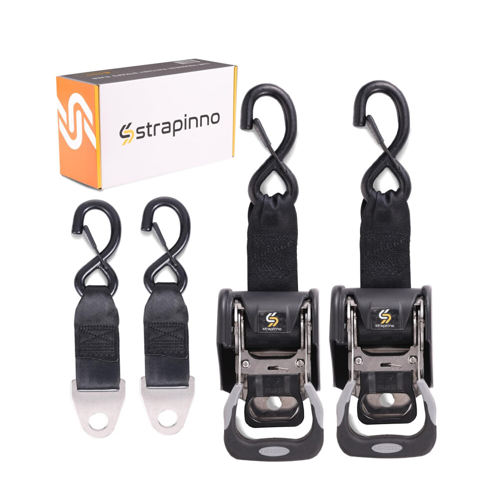 Strapinno 2PCS Stainless Steel Retractable Ratchet Straps (1 7/8 in x 4 ft) Heavy Duty Transom Tie-Downs with Extension Straps Bolt Set & Safety Latc