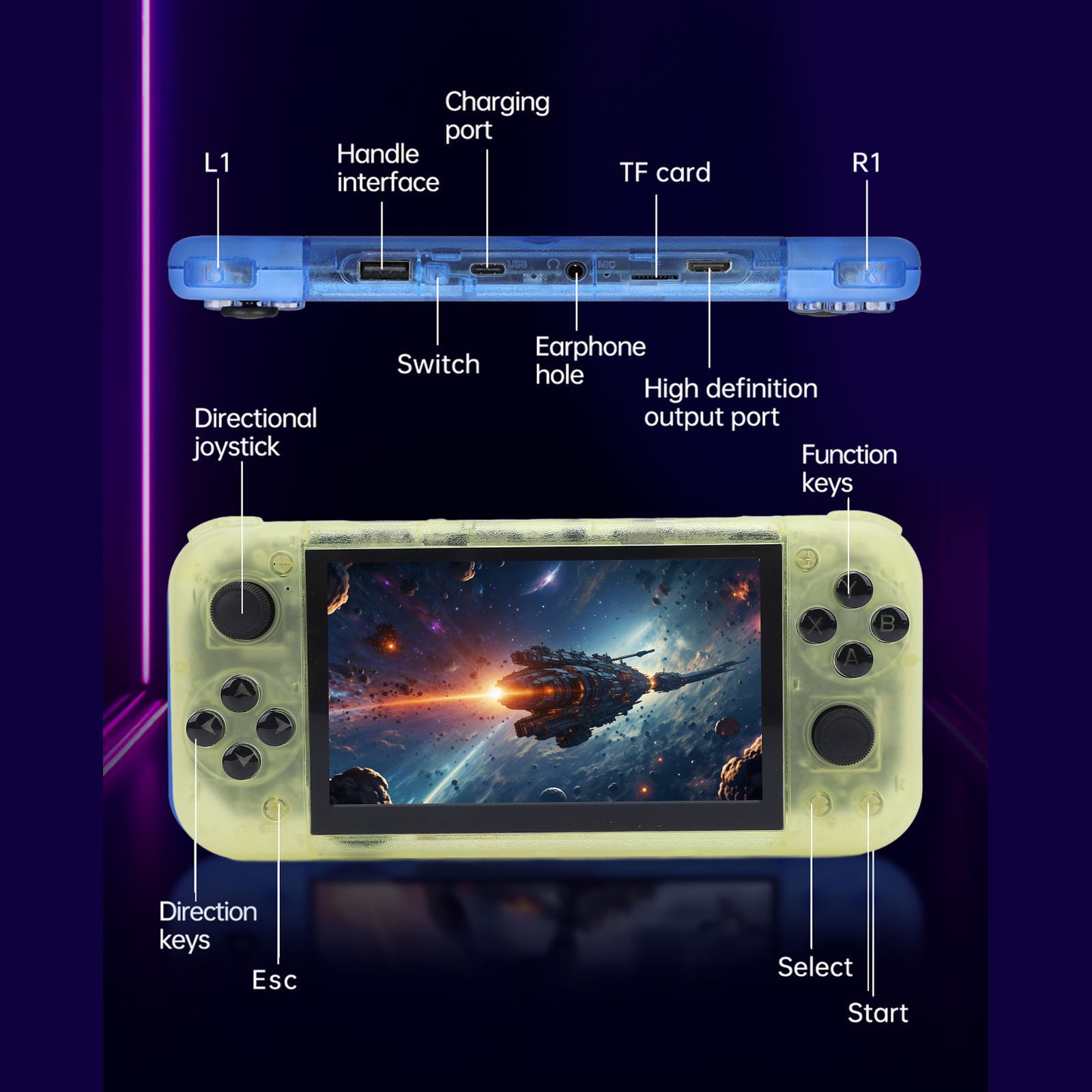 Handheld Retro Game Console 5 Inch IPS Screen 2GB DDR4 USB C Portable Video Game Console 64GB for Linux Transparent Yellow