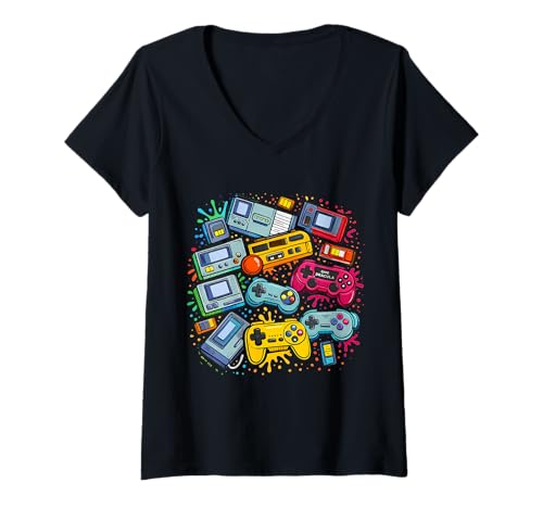 Women's Video Game Console Controllers Retro 80's 90's Gaming Arcade V-Neck T-Shirt