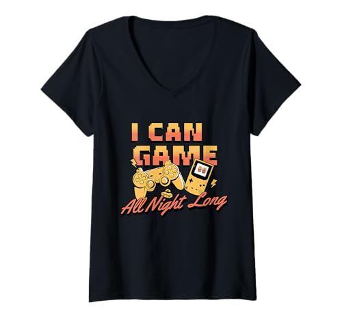 Womens I Can Game All Night Long Retro Gamer Arcade Console V-Neck T-Shirt