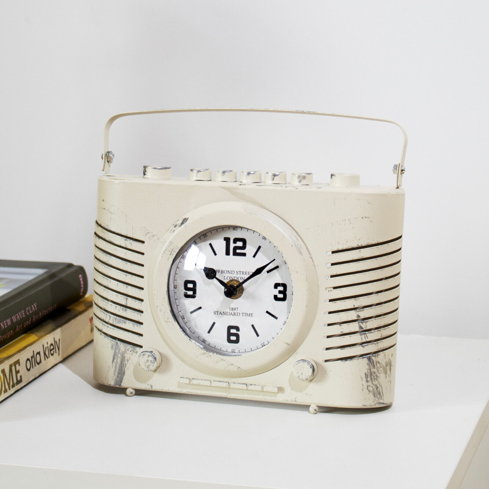 Vintage Radio Mantel Clock Cream Distrssed Metal Retro Table Desk Novelty Decor
