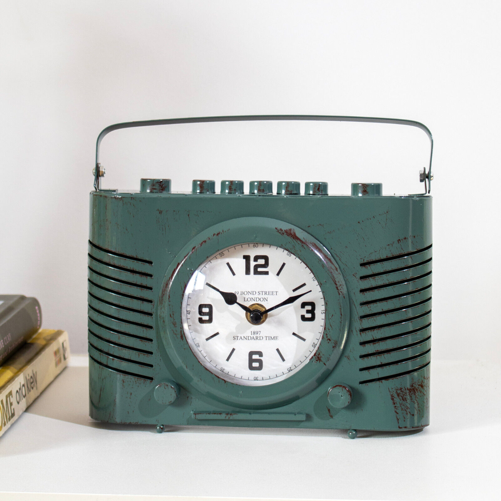 Vintage Radio Mantel Clock Green Distrssed Metal Retro Table Desk Novelty Decor