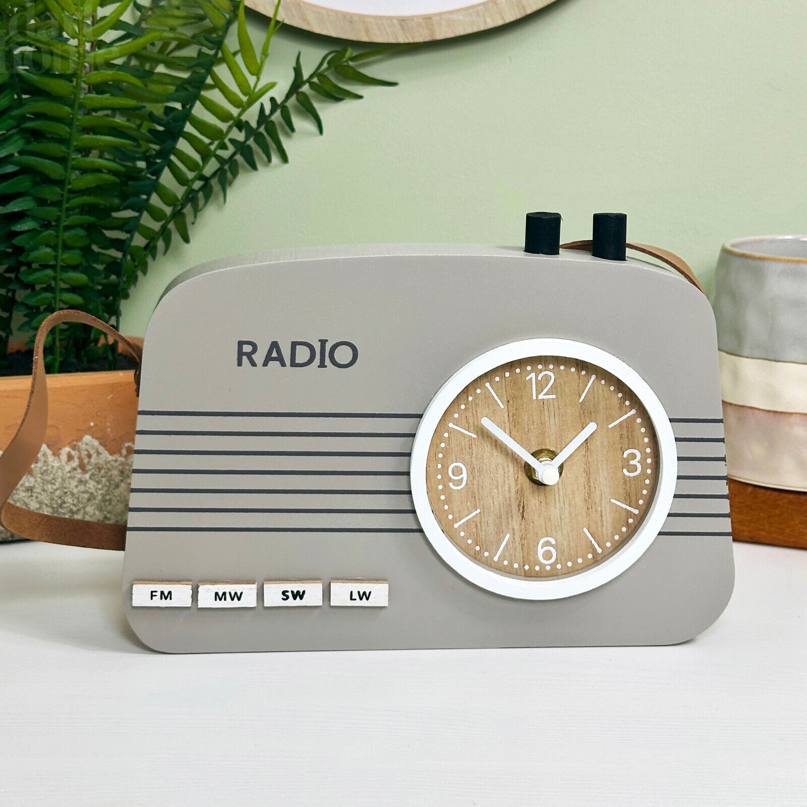 Radio Table Clock Grey Wooden Retro Home Office Desk shelf Novelty Decor Battery