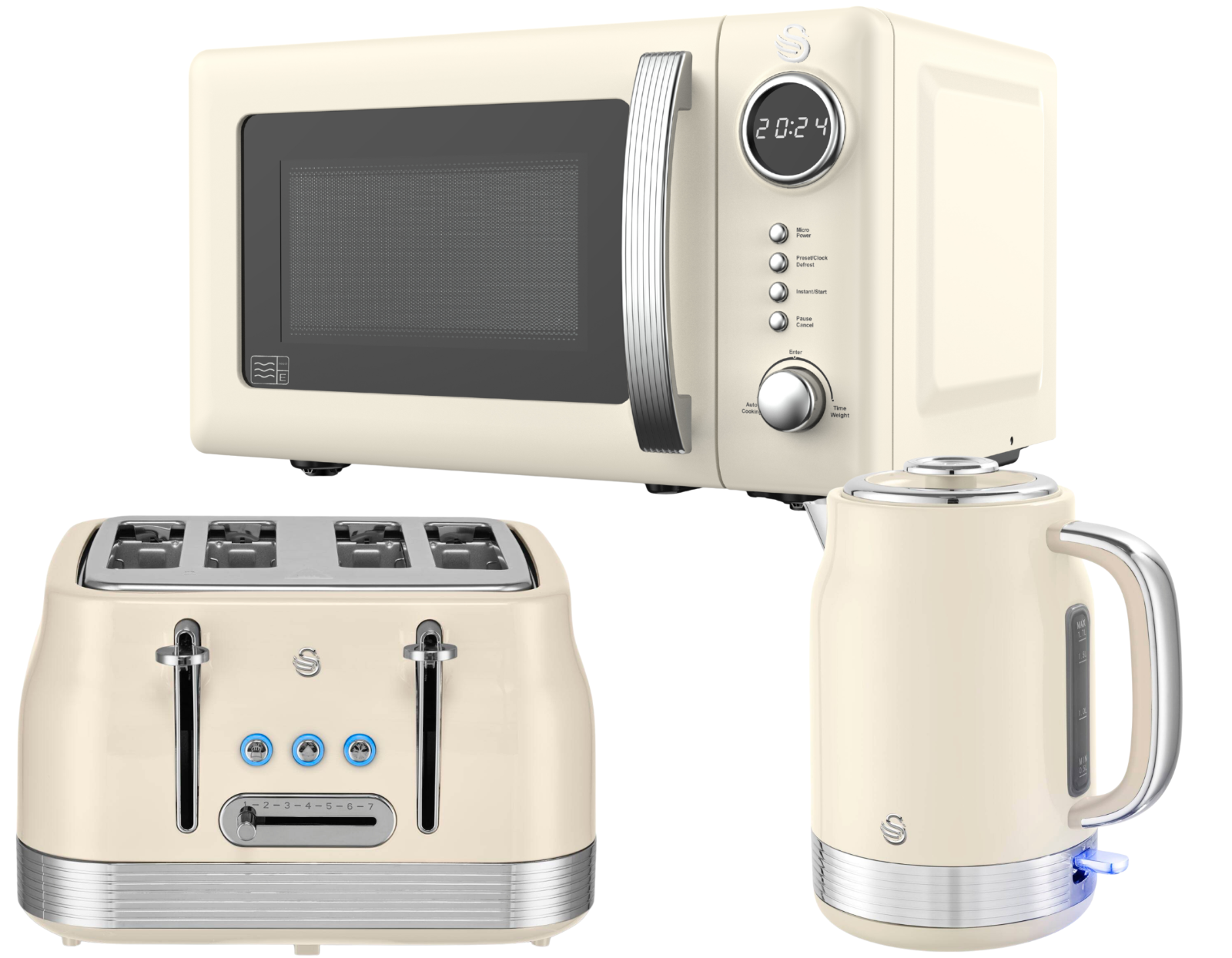 Swan Retro Revive Cream Kitchen Appliance Bundle – 1.7L Rapid Boil Kettle, 4 Slice Toaster & 800W 20L Digital Microwave, Retro Gloss Finish with Chrome Accents