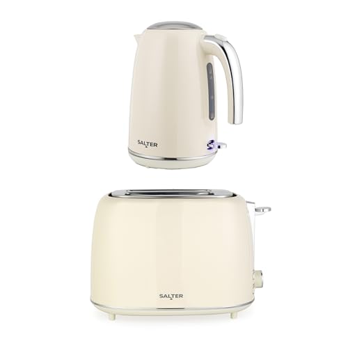 Salter Retro Cream Kettle & Toaster Set ? 1.7L 3KW Rapid Boil Cordless Kettle with Boil Dry Protection & Auto Shut-Off, 815W 2-Slice Wide Slot Toaster