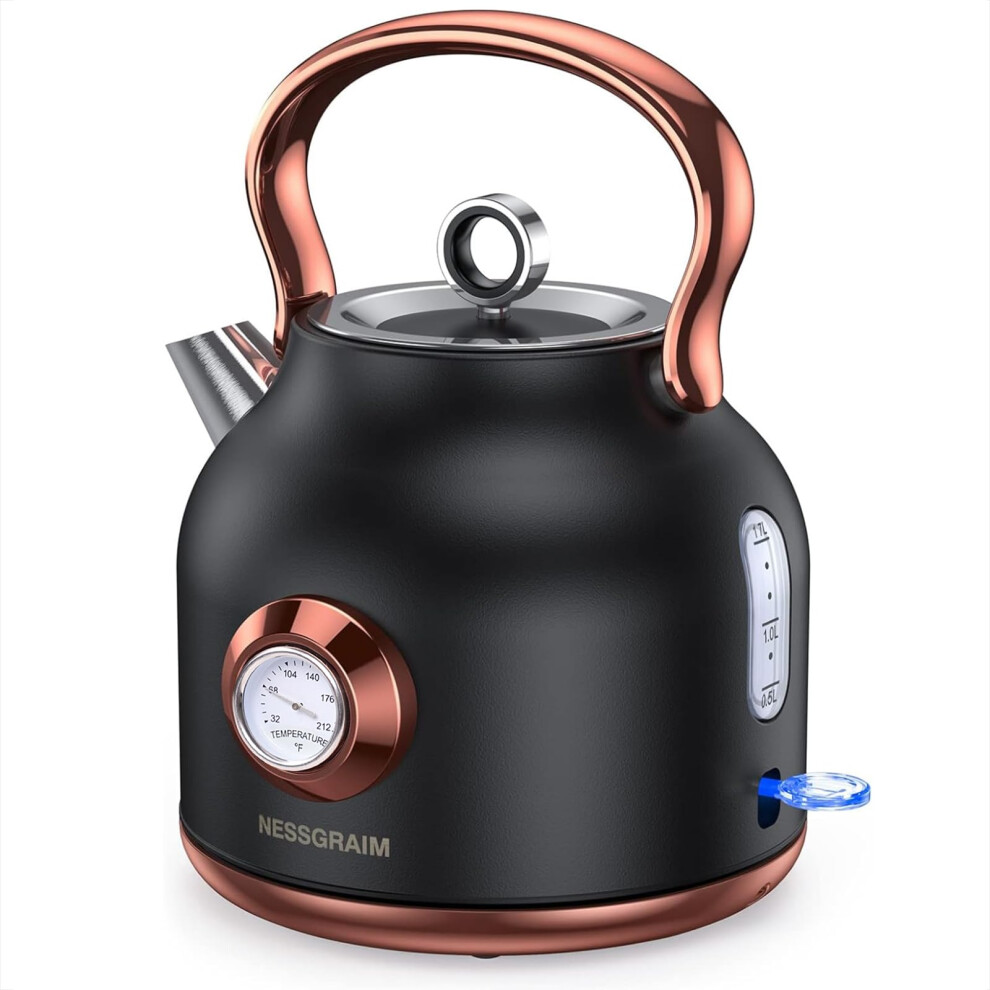 Retro Electric Kettle, 1.7L Stainless Steel Tea Kettle with Large Temperature Gauge, 2200W Fast Heating Hot Water Boiler with LED Indicator, Auto