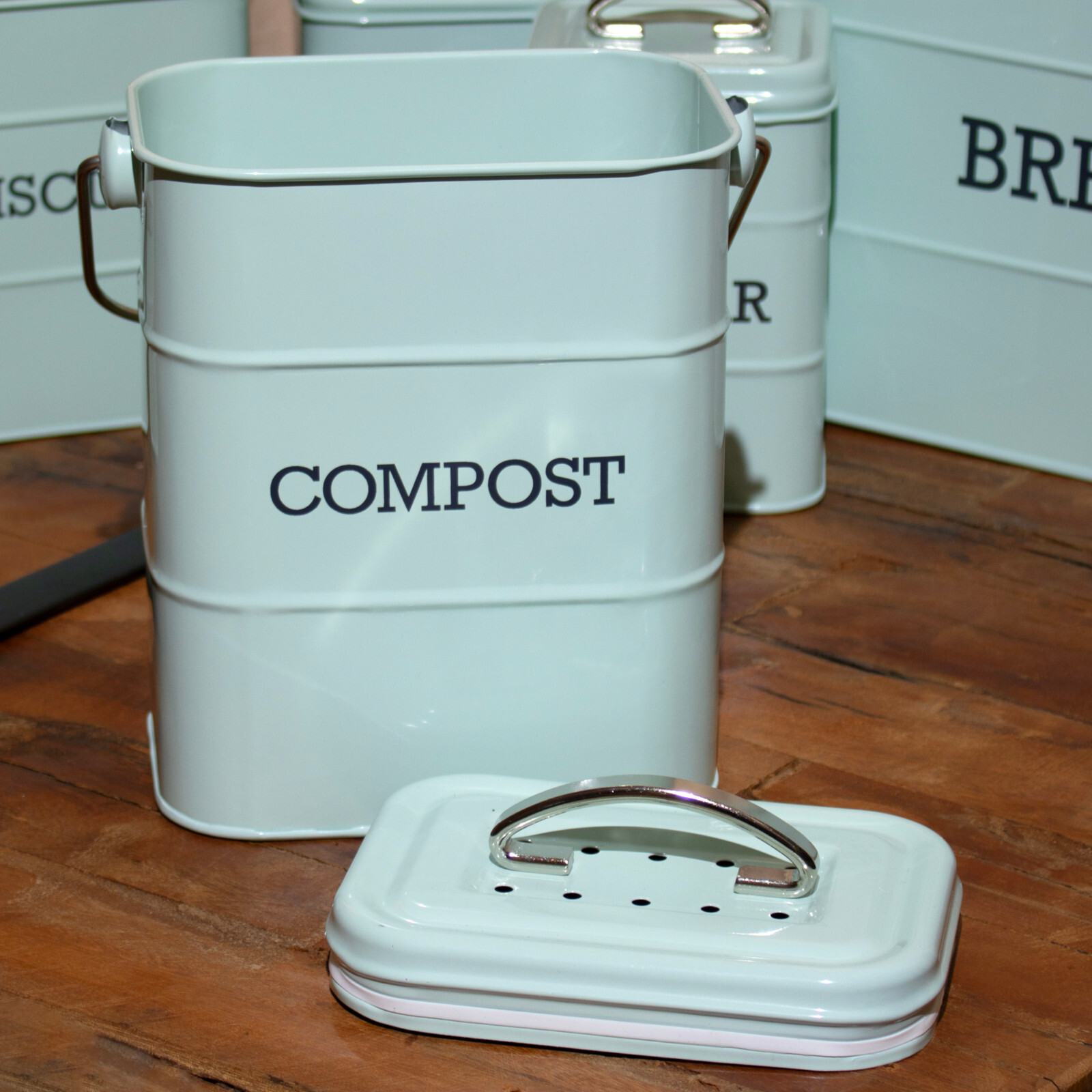 Retro Blue Kitchen Compost Bin 3 Litre Vintage Steel Metal Airtight Wood Handles