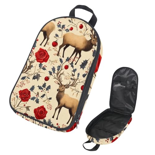 Retro Christmas Elks Red Roses Pattern Kitchenware Storage Bag for Picnic, Waterproof Portable Cookware Organizer