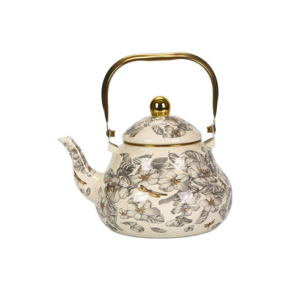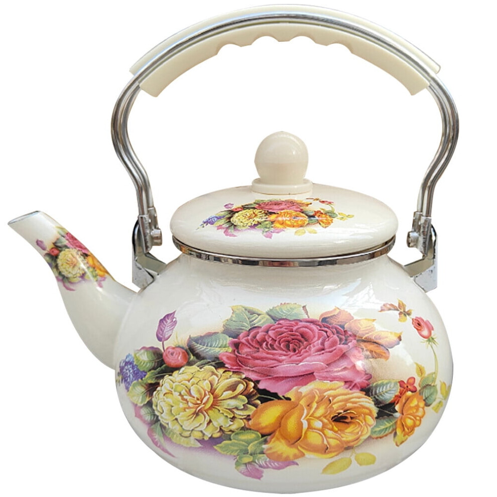 Retro Style Enamel Tea Kettle, Stovetop Compatible Induction Cooktop Floral Pattern Elegant Gift Food-Grade No Whistling Design Heat-Resistant Handle