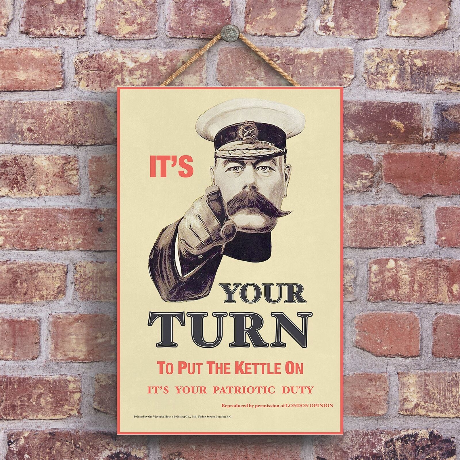 A CLASSIC COMICAL KETTLE ON RETRO STYLE VINTAGE ADVERTISEMENT ON A WOODEN PLAQUE