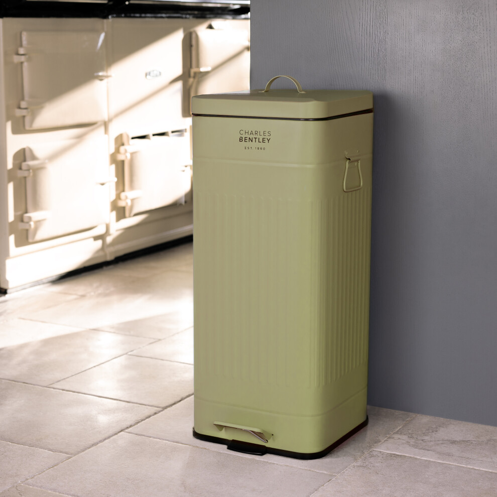 CHARLES BENTLEY Kitchen Bin, 30 Litre, Steel, Square, Retro Style, Kitchen Pedal Waste Bin, Green, Contemporary, Aesthetic, Convenient, Side And Lid
