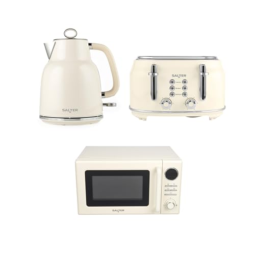 Salter Retro Cream Kettle, Toaster & Microwave Set – 1.7L Rapid Boil Kettle, 4-Slice Toaster, 6 Browning Levels, Safety Features, 20L Digital Microwave with 8 Presets, 25.5 cm Glass Turntable