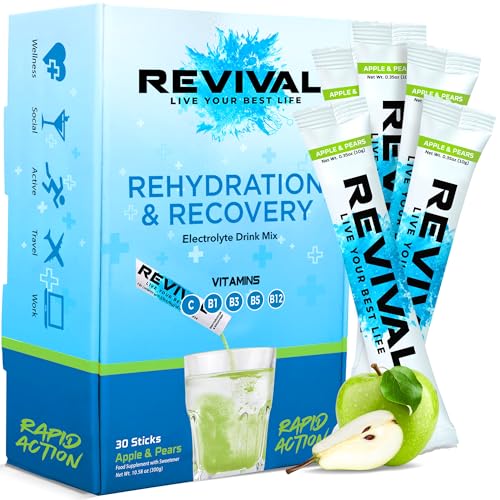 Revival Rapid Rehydration Electrolytes Powder - High Strength Vitamin C, B1, B3, B5, B12 Supplement Sachet Drink, Effervescent Electrolyte Hydration Tablets - 30 Pack Apple Pear