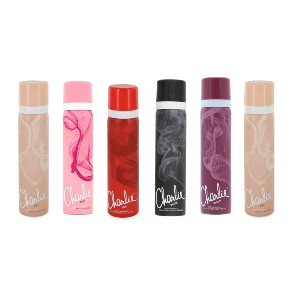 Charlie Body Spray 75ml Mix Pack Of 6 Deodorant Black, Chic, Pink, Red
