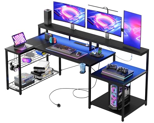 Bestier 181CM L-Shaped Gaming Desk with RGB LED Lights, Power Outlets, USB Ports, Carbon Fibre Surface, Monitor Stand, Storage Shelf, Cup Holder & Headset Hook