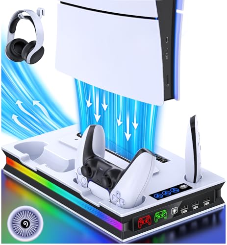 RGB Cooling fan Stand for PS5 Slim Console, Game Cooling Stand Dual Controller Charger Station Headset Holder for P5 slim Console