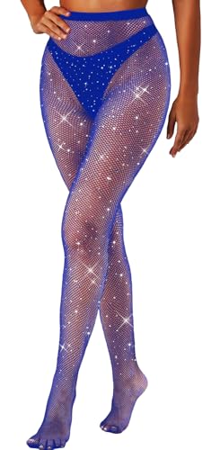 RSLOVE Women Sexy Fishnet Stockings Sparkle Rhinestone Mesh Tights High Waist Pantyhose Blue