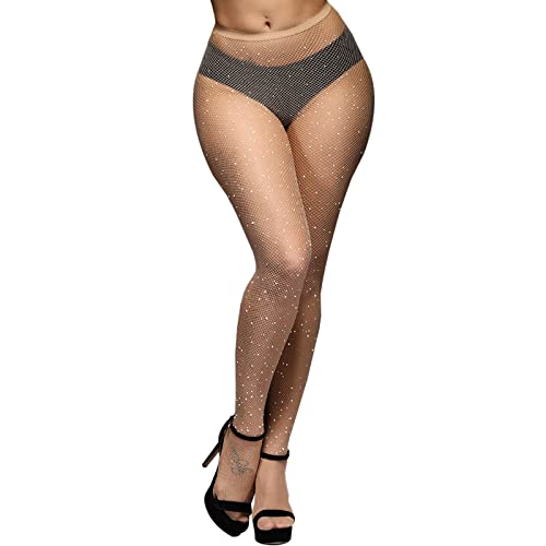 DancMolly 10X Strong Ultra Sparkly Rhinestone Fishnet Stockings, Plus Size Sparkle Fish Net Tights for Women, Sexy Party Concert Outfit, 1 pair Nude 2XL-4XL