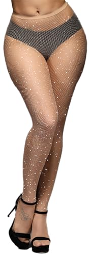 DancMolly 10X Strong Ultra Sparkly Rhinestone Fishnet Stockings, Plus Size Sparkle Fish Net Tights for Women, Sexy Party Concert Outfit, 1 pair Nude M-XL
