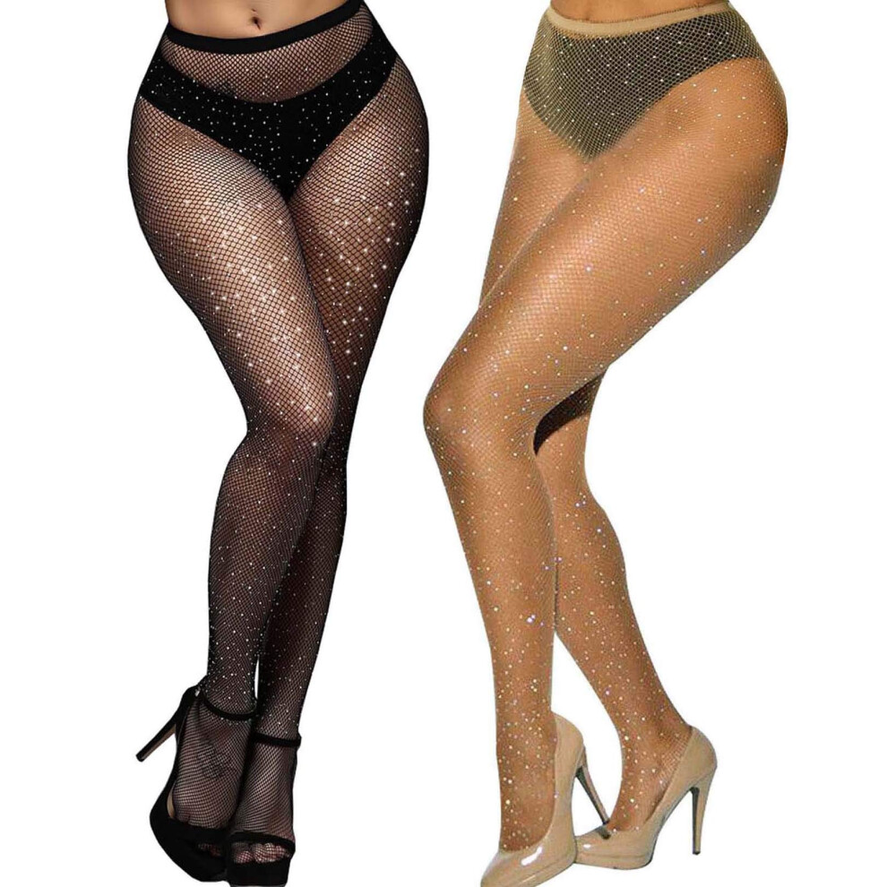 SNDE 2 Pieces Sparkly Fishnet Tights Womens With Rhinestone,Shiny Diamante Tights For Parties, Proms, Role Play, Festival Diamond