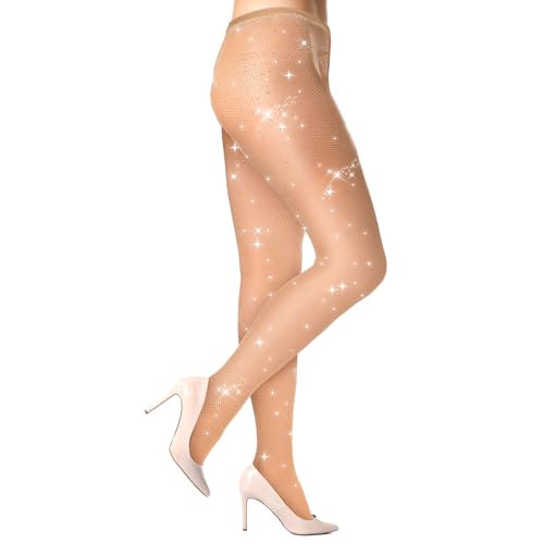 CozyWow Sparkly Fishnet Tights for Women, Sexy Rhinestone Fishnets Stockings, Women’s Glitter Tights for Dancing & Party-Nude-Plus