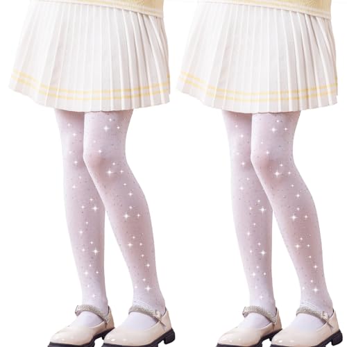 LOLANTA Girls All-over Rhinestone Tights, Sparkly Semi-opaque Pantyhose for Dance, Party, Performance, 2 Pairs, White, 6-8 Years, M