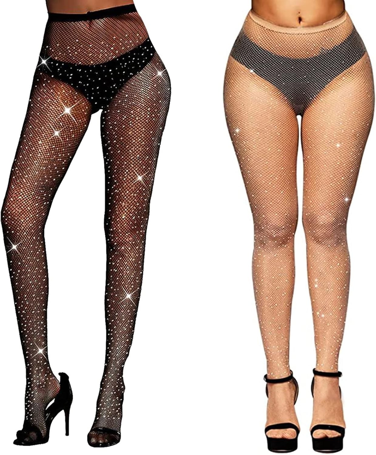 KLONKEE 2 PCS Sparkly Tights Glitter Rhinestone Fishnet Tights Womens, Sparkle Diamante Nude Fishnet Stockings High Waist Stretchy Mesh Pantyhose for Women