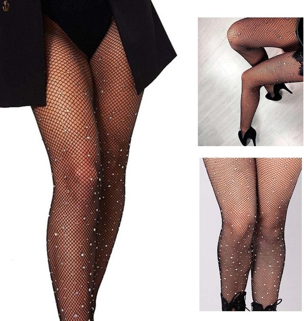 WLLHYF Women Sparkly Fishnets Stockings High Waist Fishnet Tights Rhinestone Party Pantyhose Mesh Diamond Glitter Stockings