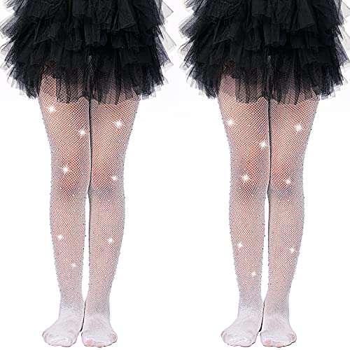 MANZI Girls Fishnet Tights Rhinestone Black Tights for Girls Sparkle Fishnet Stockings for Ballet Costume Halloween(Pack of 2) White