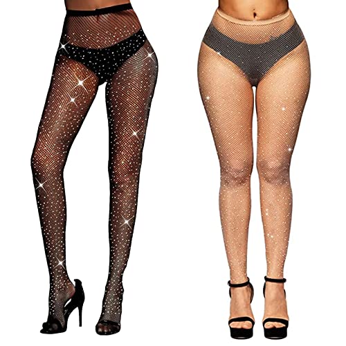 TSHAOUN 2 Pack Rhinestone Fishnet Tights for Women, Stretchy Rhinestone Glitter Tights Sparkly Tights Diamond Fishnet Stockings, for Parties, Proms, Role Play, Halloween, 2 Colour (Black,Nude)