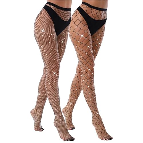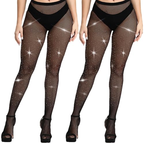 KLONKEE 2 pcs Sparkle Fishnet Tights Rhinestone Tights High Waist Mesh Stockings Sparkle Pantyhose for Women