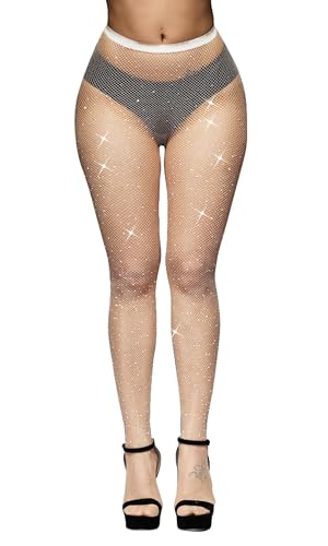 RSLOVE Women Sexy Fishnet Stockings Sparkle Rhinestone Mesh Tights High Waist Pantyhose Lingerie White