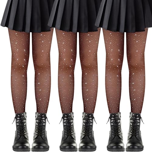 BQMEZRNUS 3PCS Girls Fishnet Tights Sparkle Thin Rhinestone Pantyhose Black Mesh Stockings Footed Fishnets with Black Glitter Tights for Girls Ballet Dance Stage Costume Halloween Party Gymnastics
