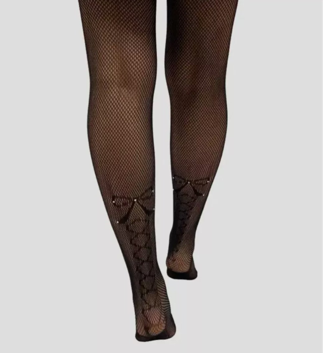 Fishnet Tights Knitted Bow Diamantes Sexy Rhinestone Office Party Black TBODIA