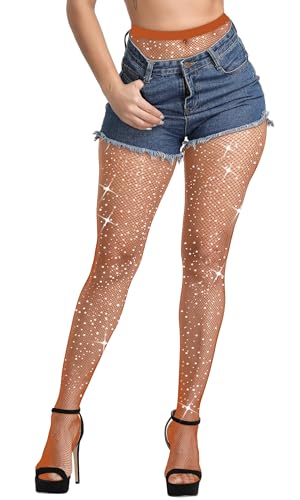 Fohevers Glitter Tight for Women Sparkly Rhinestone Diamond Fishnets Diamante Disco Tights Fishnet Socks Pantyhose, Caramel