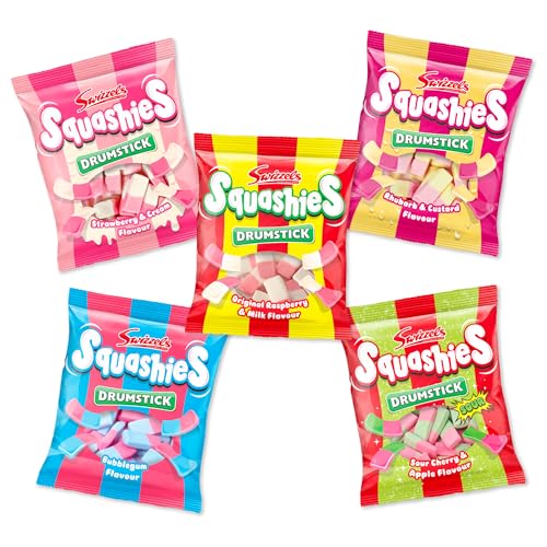 Swizzels Squashies Sweets Bundle (5 x 140g Bags) – Original Raspberry & Milk, Sour Cherry & Apple, Bubblegum, Rhubarb & Custard & Strawberries & Cream – Assorted Soft Chewy Foam Candy Multipack