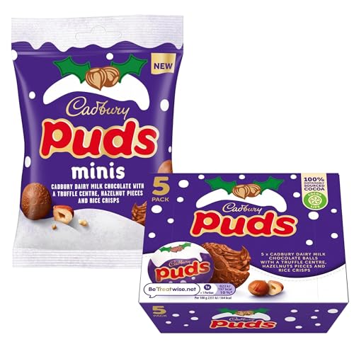 Cadbury Dairy Milk Puds Christmas Bundle, Includes 5 x Chocolate Puds & 73 g Bag, Truffle Centre with Hazelnut Pieces & Rice Crisps, Perfect Stocking Fillers
