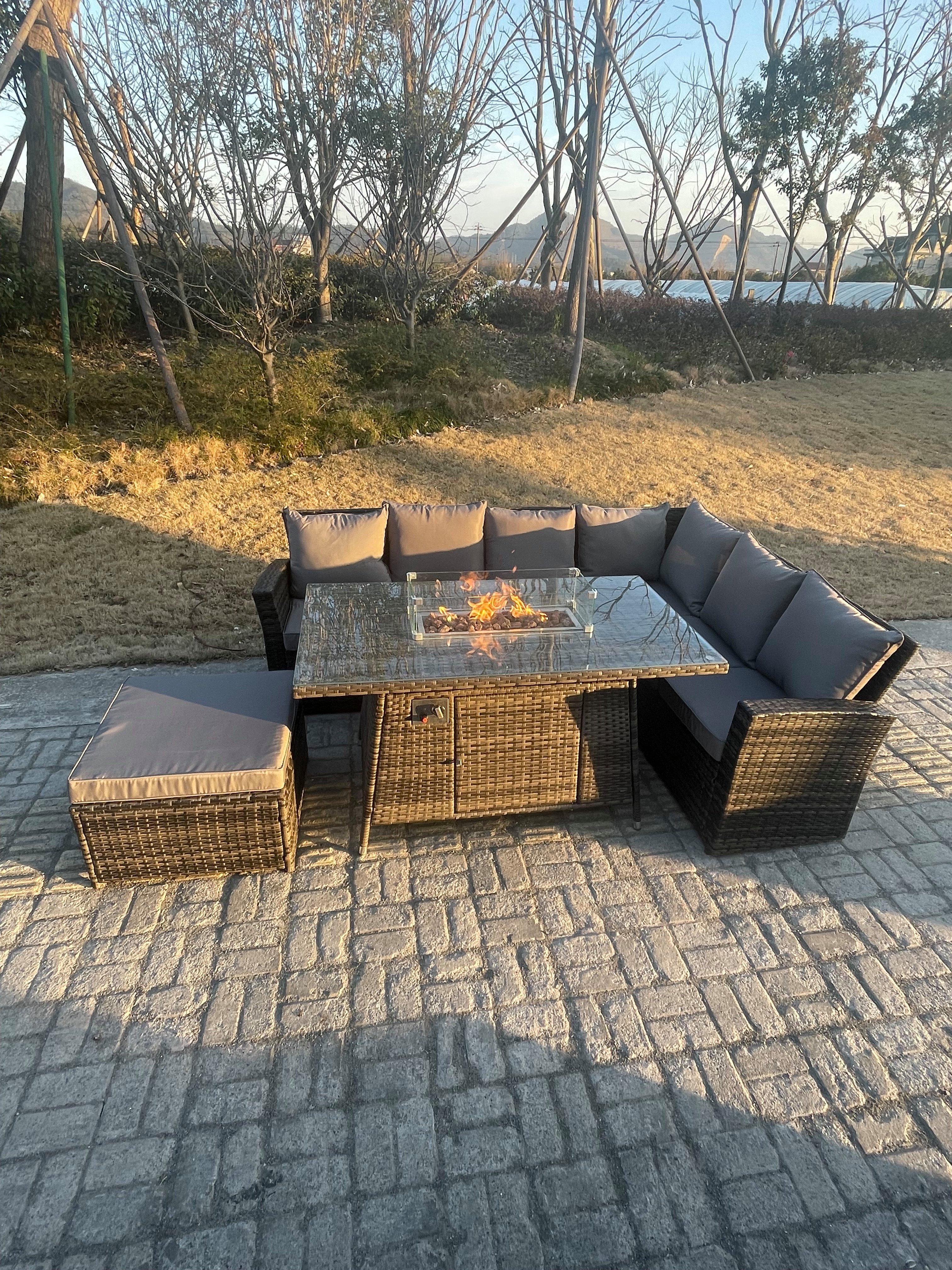 High Back Rattan Garden Furniture Sets Gas Fire Pit Dining Table Right Corner Sofa Small Footstools Chair 9 Seater