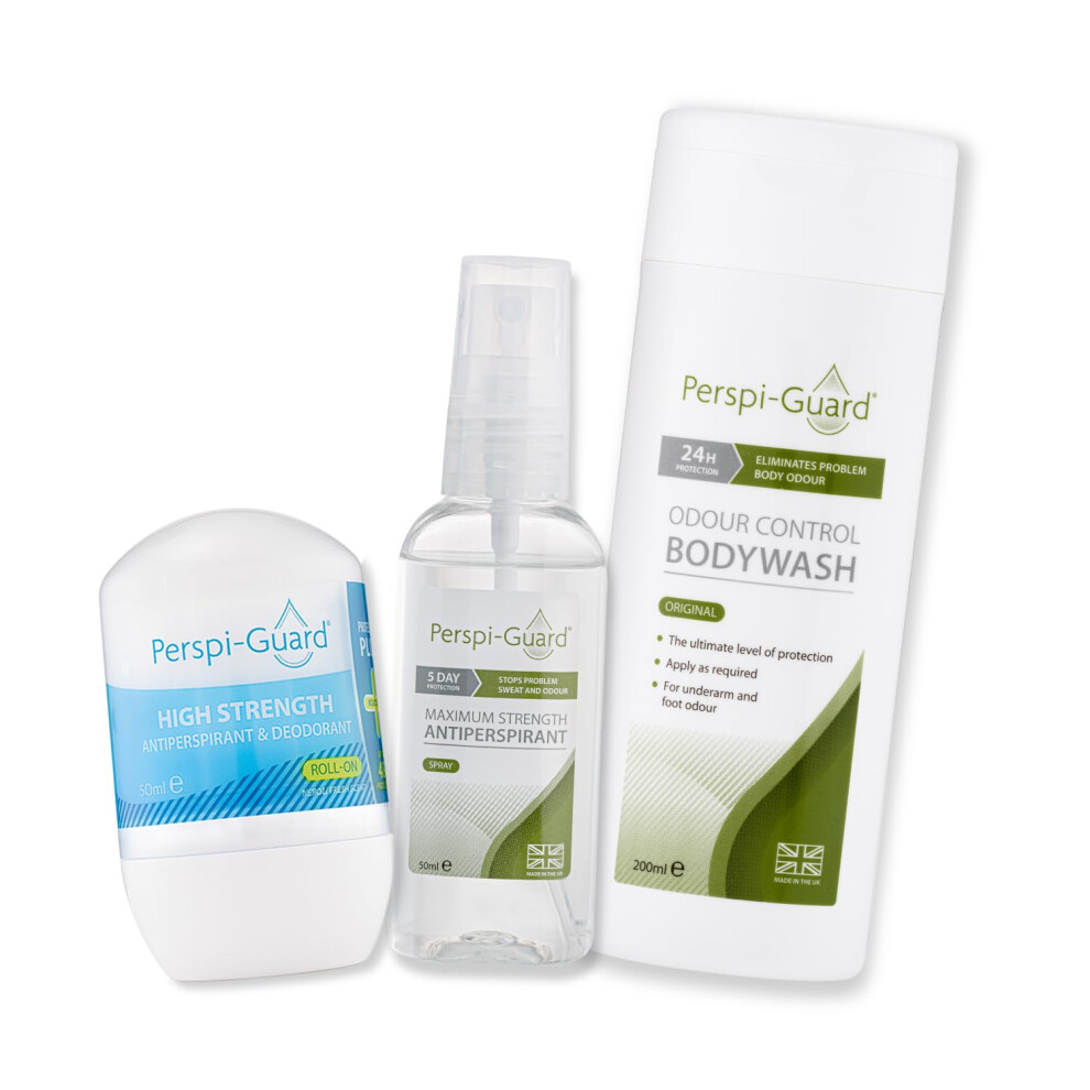 Perspi-Guard 3-Step Treatment Pack, Odour Control Body Wash, Max Strength Antiperspirant Spray and Strong Roll On Deodorant for Men and Women, 3-Pack