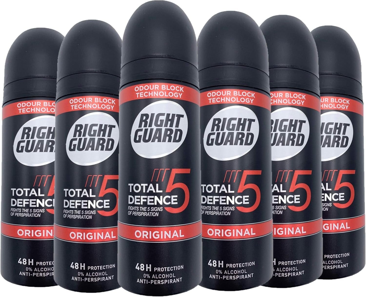 Right Guard Mens Deodorant, Total Defence 5, Original Anti-Perspirant Spray, 6 X