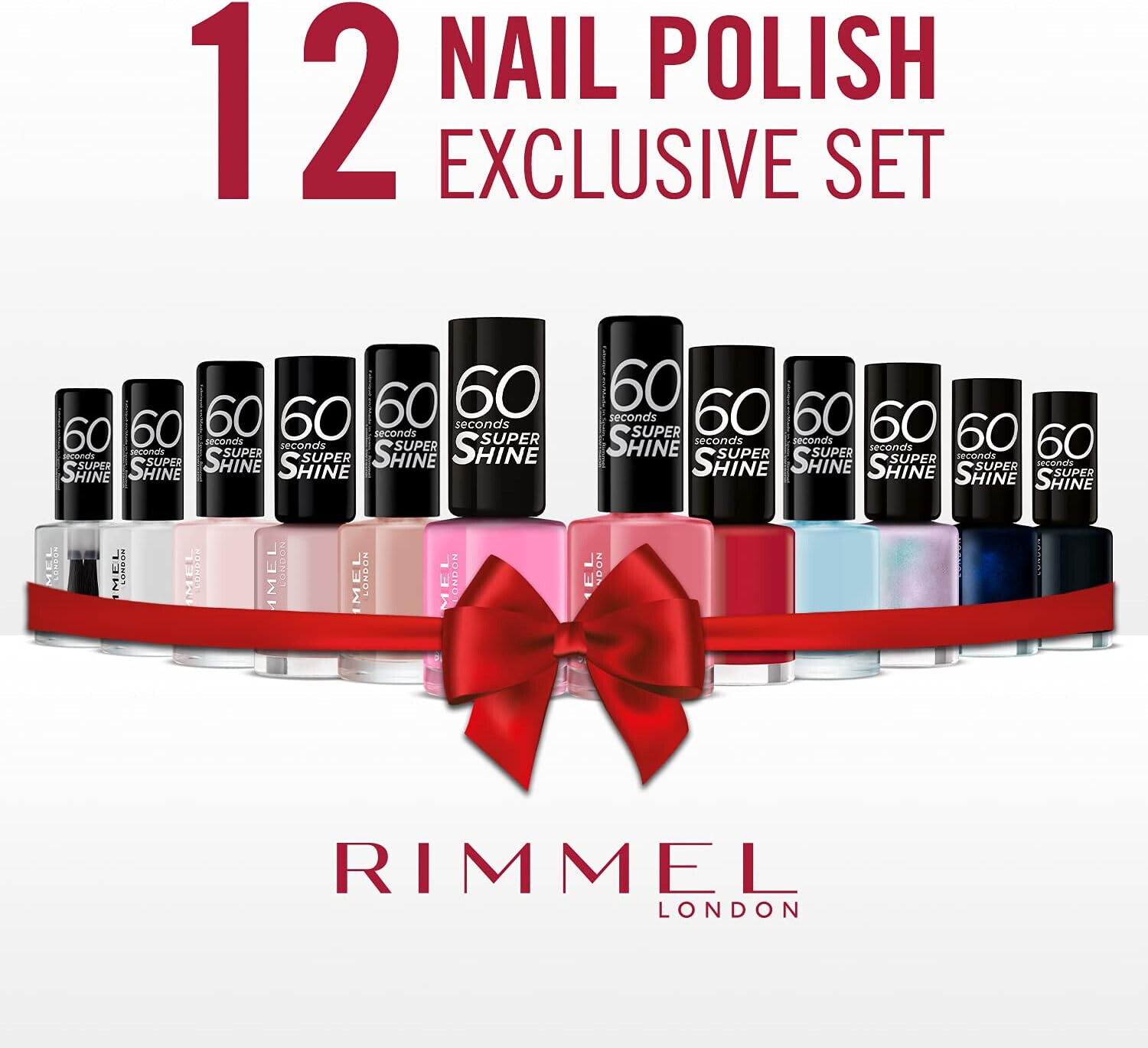 RIMMEL LONDON - 60 Seconds Super Shine Nail Polish Set - Super Glossy, Ultra Shiny Finish - Precise One Stroke Application - Up To 10 Days Wear - High Impact Colour - 12 Assorted Shades