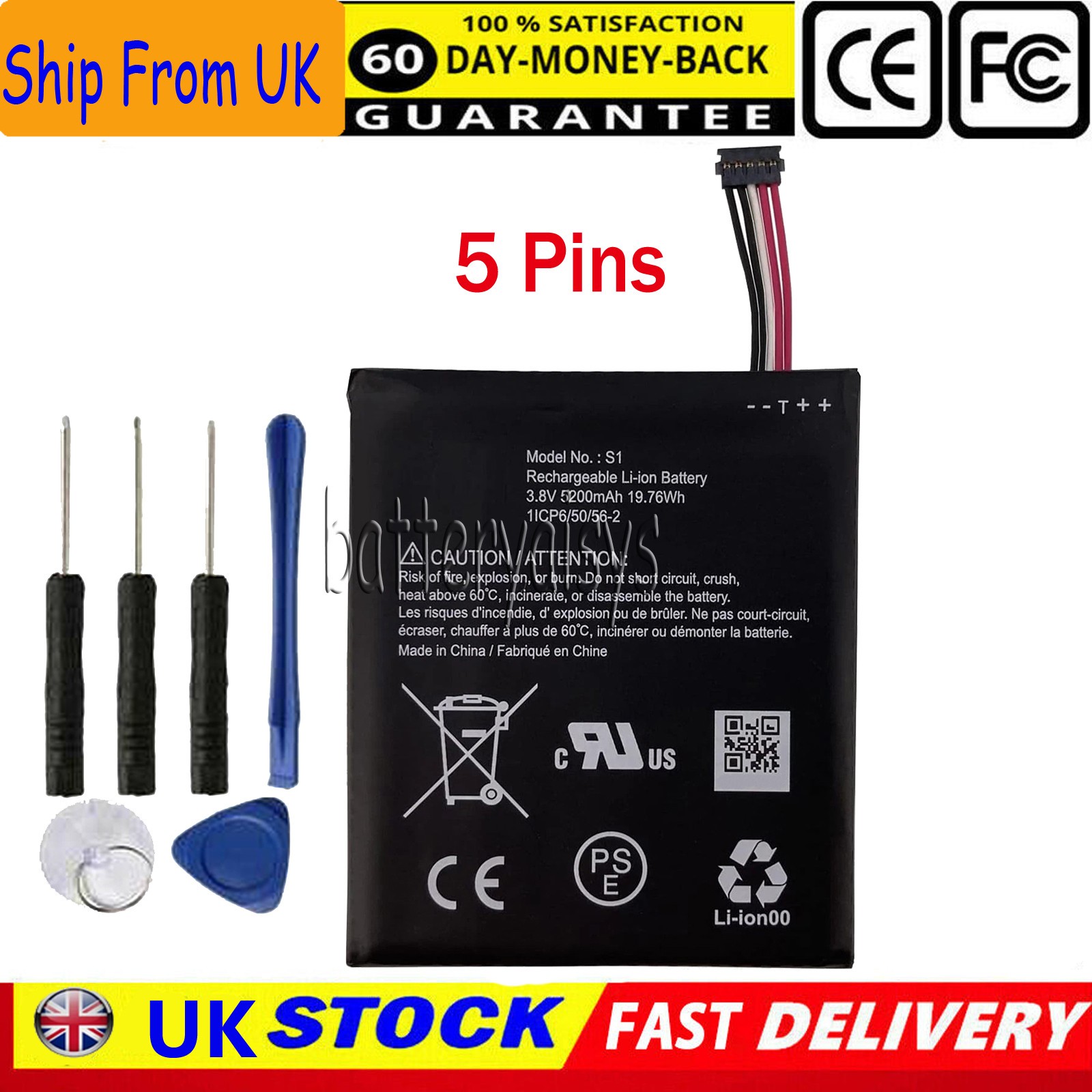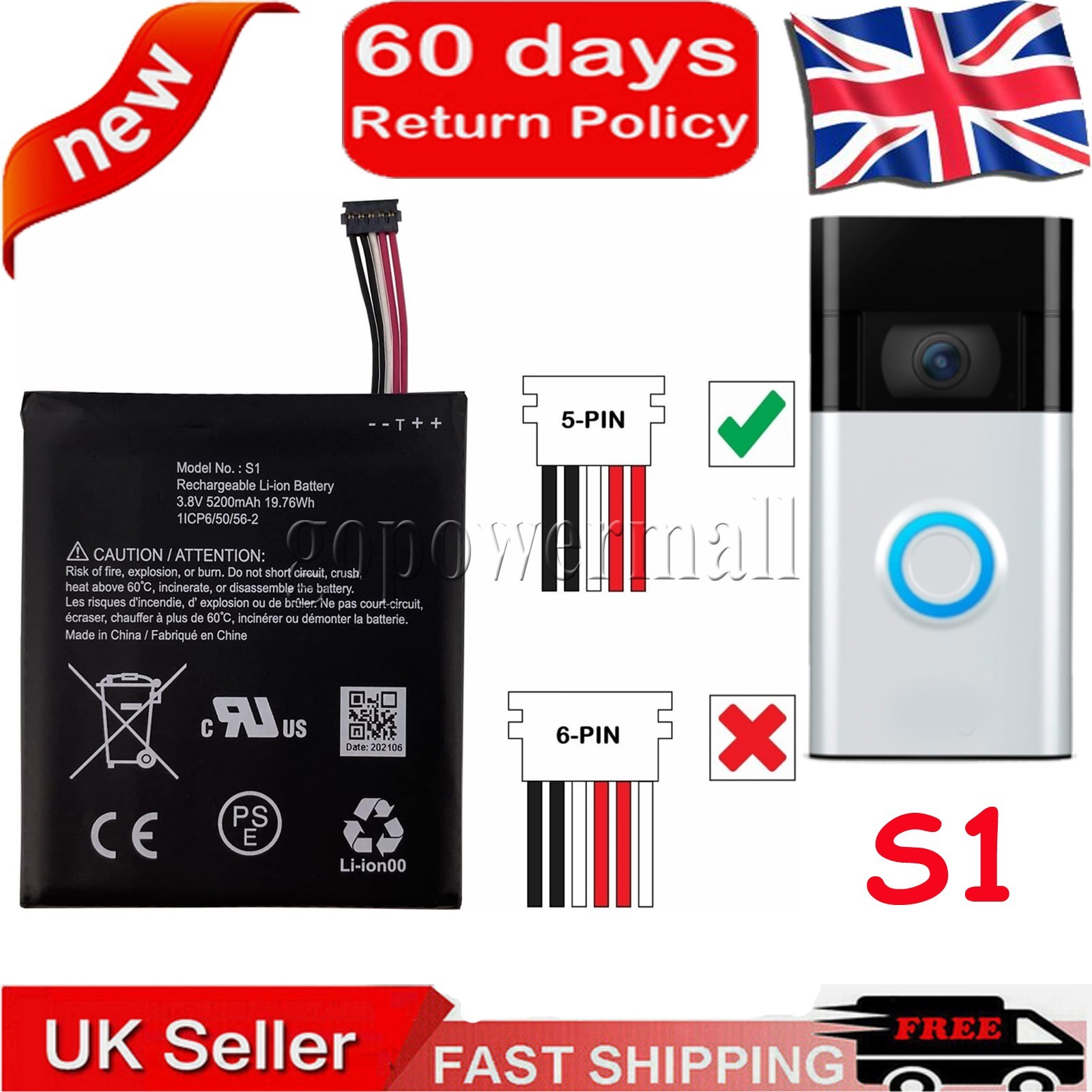 S1 Battery for Ring Video Doorbell (2nd Gen)–2020 release with 5Pin Plug Wires