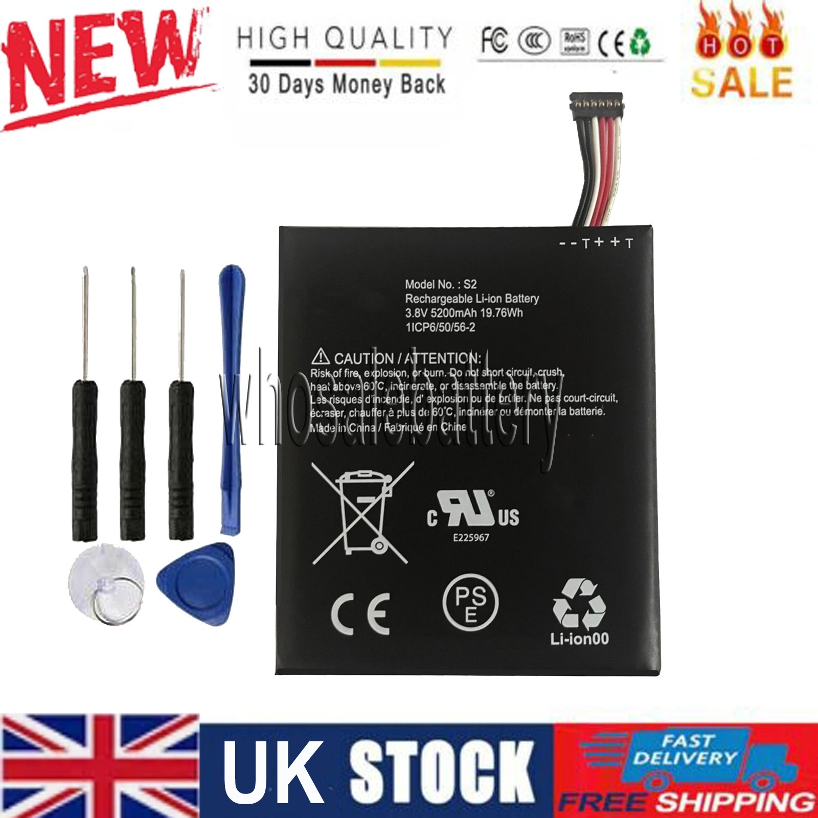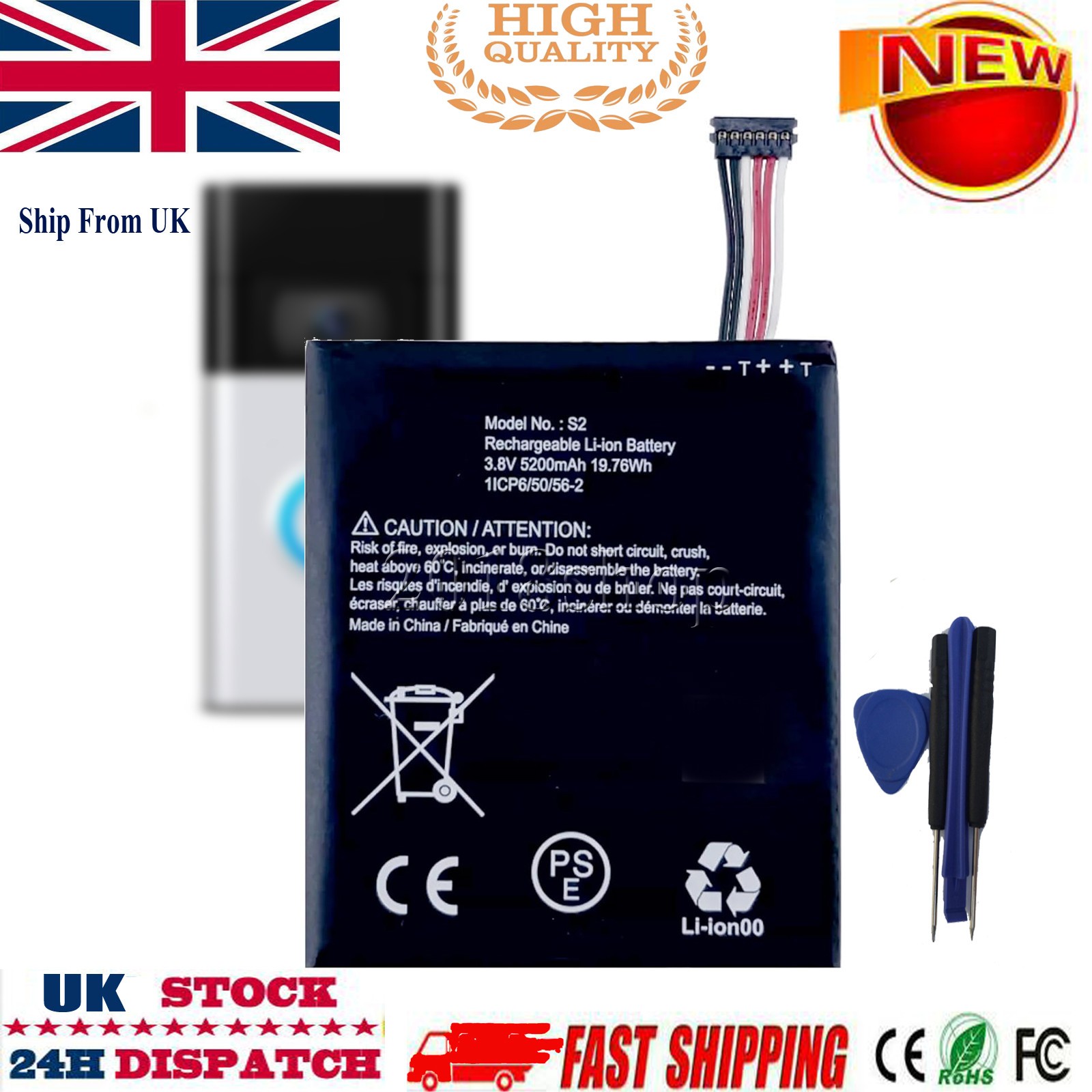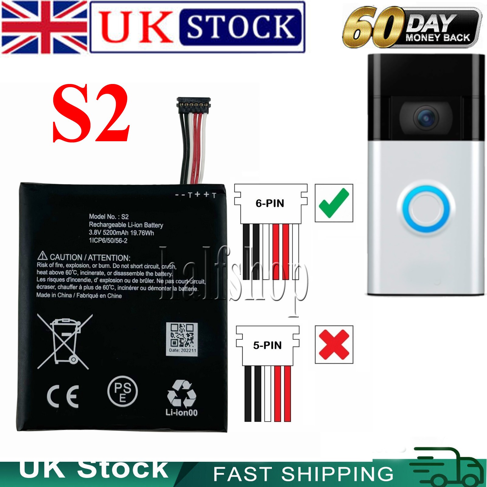 New Battery S2 (6 pins) 5200mAh for Ring Video Doorbell 2nd Gen (6 cable Only)