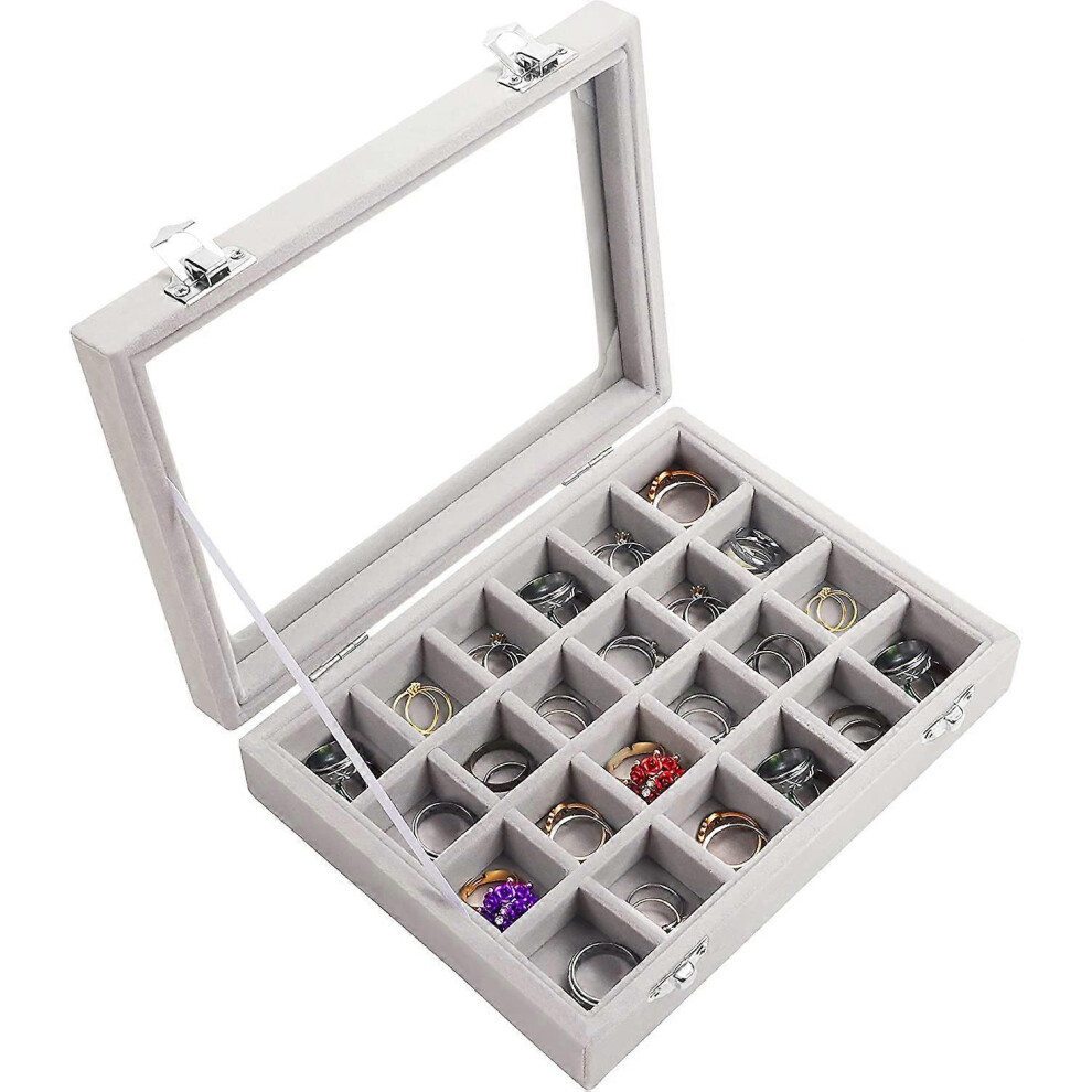 (As show, One size) Jewelery and Ring Box in Gray (24 Sections) - L20.2 x W15.1 x H4.6 cm - Jewelery Box with Compartments and Glass Lid - for Rings,