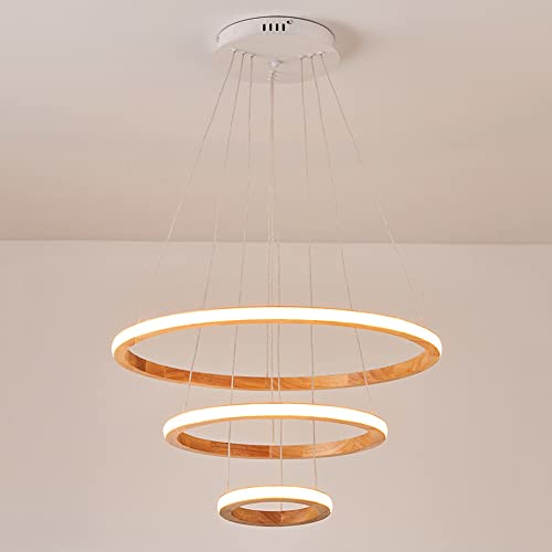 Wood Hanging Chandelier LED Ring Pendant 3-Lights Dining Table Chandeliers Ceiling Light, Round Wooden Suspension Lamps for Living Room Kitchen Bedroom