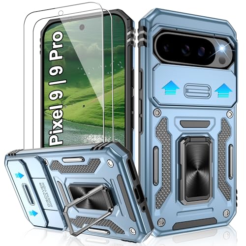 Jshru for Google Pixel 9 Case,Pixel 9 Pro Case,with 2 Pack Screen Protector,Military Grade Shockproof Case with Slide Camera Cover,Ring Stand Phone Cover for Google Pixel 9 | Pixel 9 Pro,Light Blue