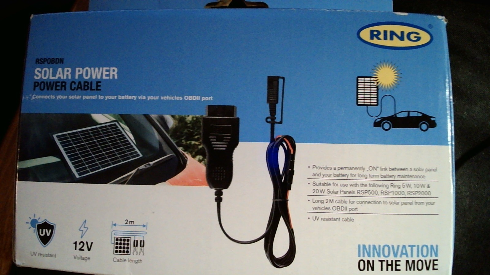 Ring Solar Power Cable. RSP0BDN. Connects solar panel to battery via OBDII port.